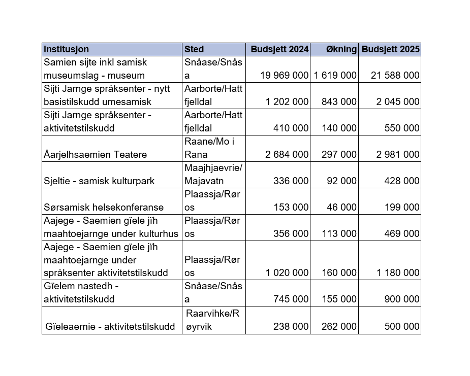 Åarjelhsaemien teatere får en økning på 200 000 kr, Sjeltie på Majavatn styrkes med 80 000 kr, Aajege på Røros styrkes med 100 000 kr. Også sørsamisk helsekonferanse styrkes med 40 000 kr. Dette i tillegg til dekning av lønns- og prisvekst på 3,6%.